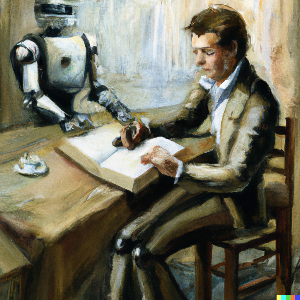 “A painting of a man sitting at a desk writing in a old book, with a small humanoid robot next to him.”