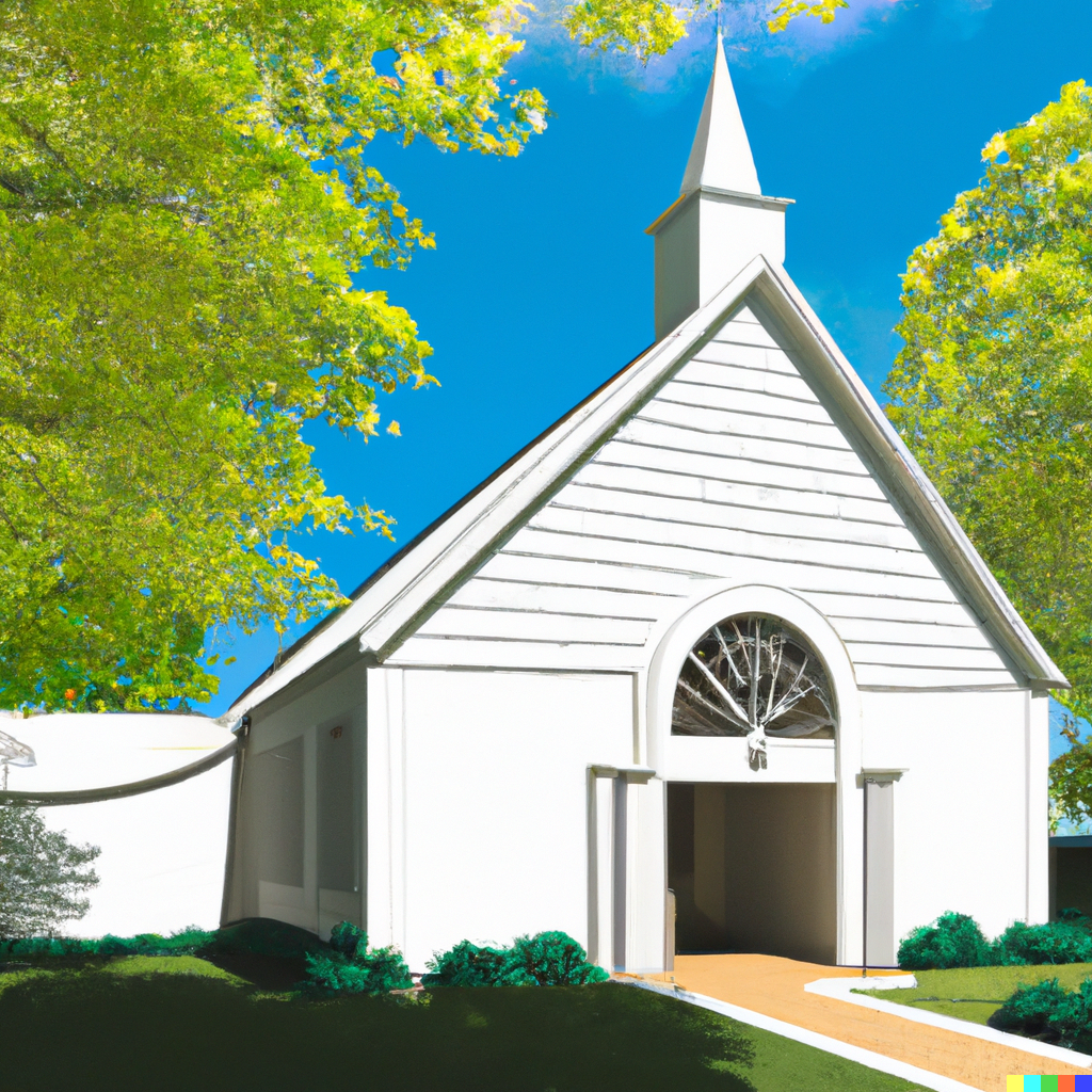 Benjamin James, via DALL-E 2 “An artists impression of a latter-day saint chapel, seen from the outside on a sunny day.”