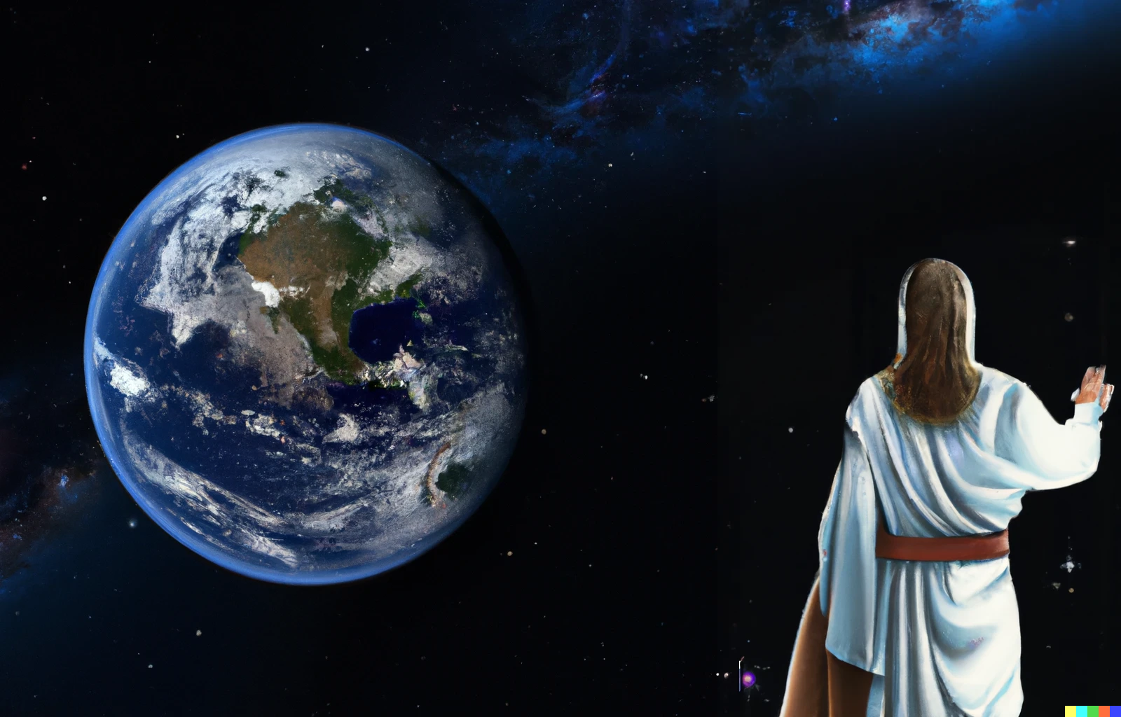 An photo of the whole earth seen from space with stars in the background. Jesus wearing a white robe and red sash seen from the side pointing towards the earth.